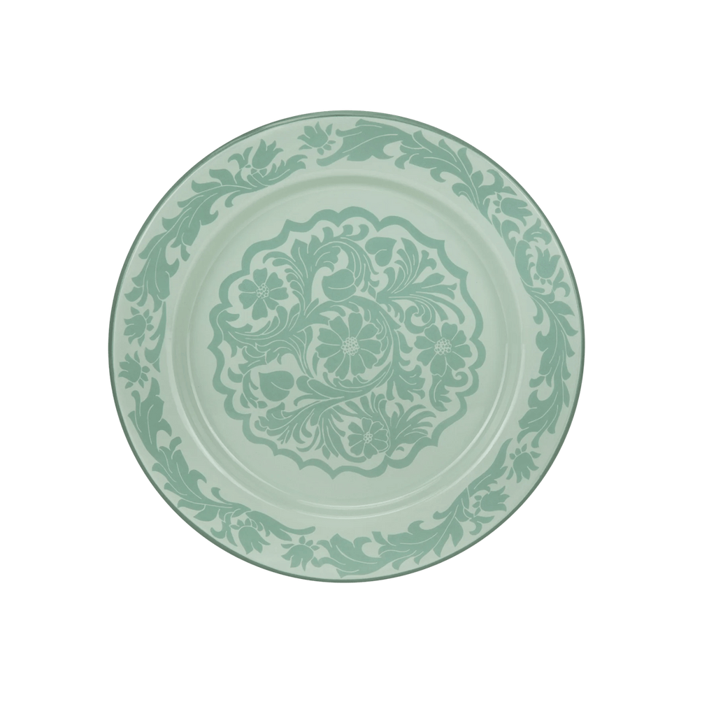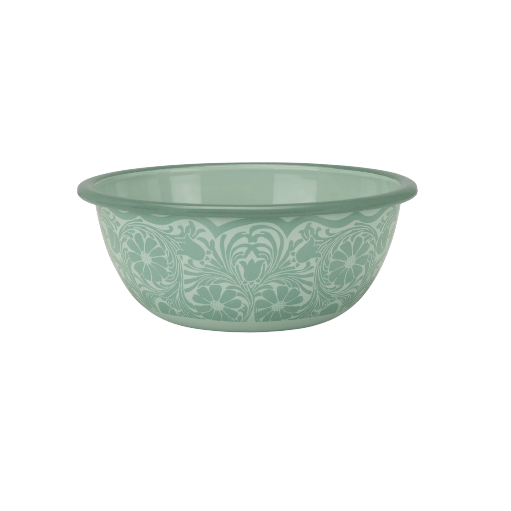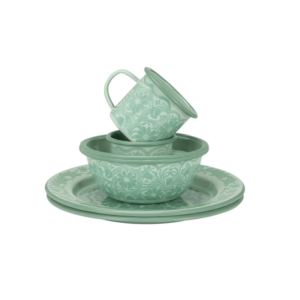 The set includes two plates, two bowls, and two mugs, all crafted from enamel-coated steel with a porcelain glaze for added strength. The soft mint base is complemented by a delicate floral pattern and hand-painted edge detailing, giving each piece its own unique, artisan character.