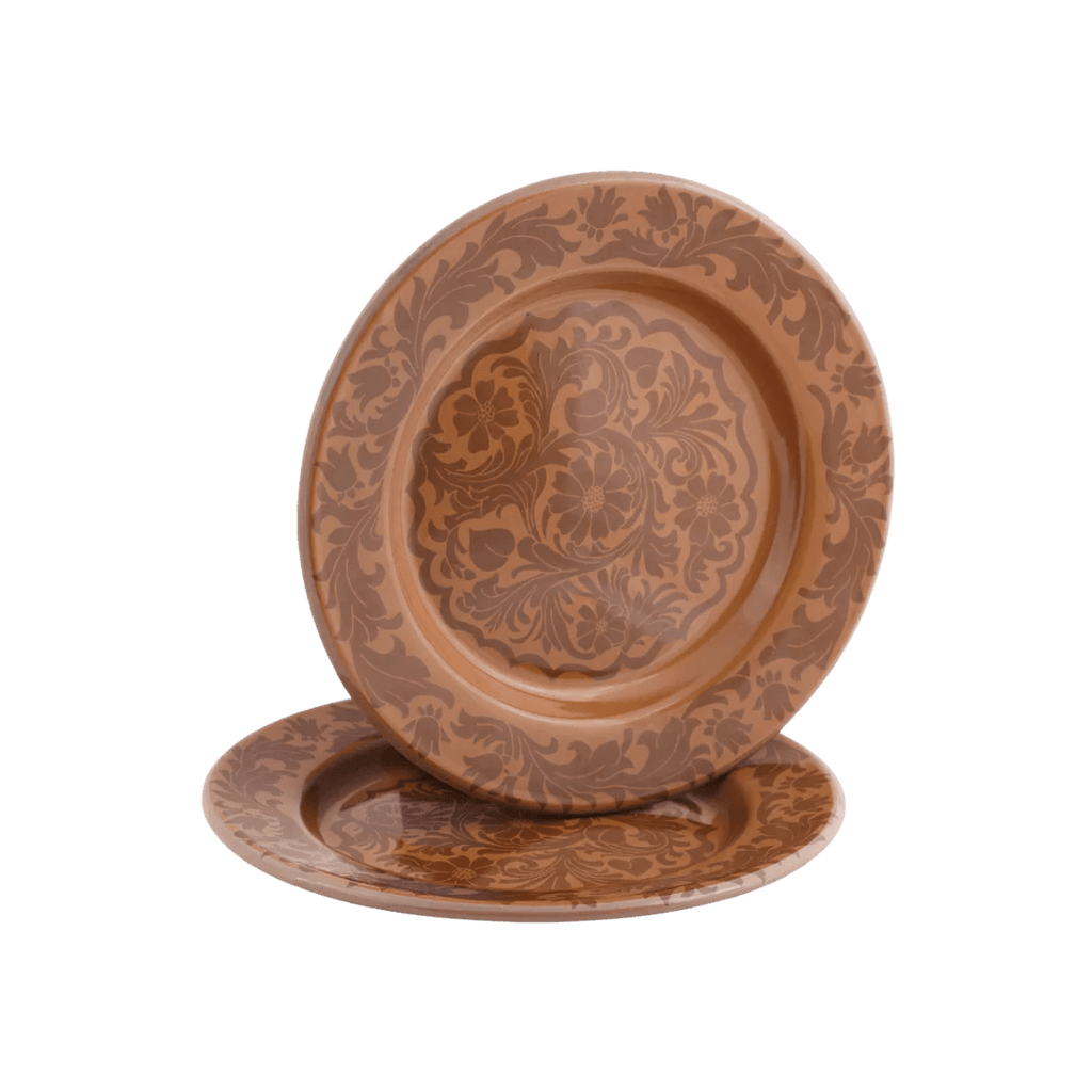 The set includes two dinner plates, two bowls, and two mugs, all made from durable enamel-coated steel and finished with a porcelain glaze. Each piece features a soft toffee-coloured base, a contrast mint floral print, and a hand-painted edge, giving it that unique, artisanal look.