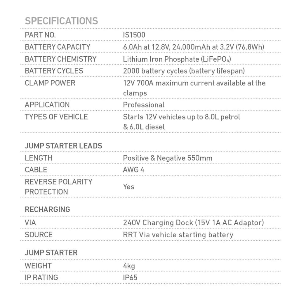 Built for busy workshops and roadside teams, the Intelli-Start IS1500 delivers serious starting power in a compact, easy to handle unit. It starts 12V petrol engines up to 8.0L and diesel up to 6.0L, with rapid recharge tech that recovers in about 40 seconds when left connected to the vehicle battery. Premium spark-free clamps add a layer of safety, while clear LED indicators show charge level and status at a glance. Store it on the included docking station so it stays topped up and ready. The ergonomic handle keeps it comfortable in hand all day. Backed by a 2 year warranty.