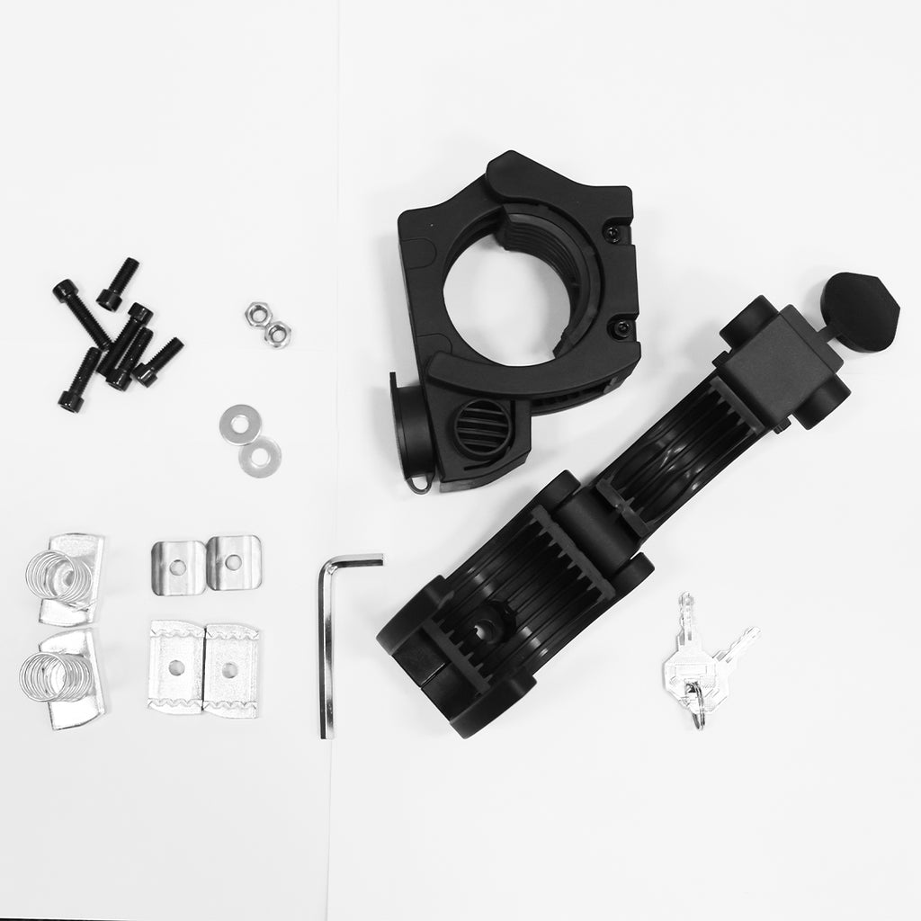 This Lockable Tool Holder is designed to securely mount round-handled tools between 20mm and 50mm in diameter, providing a stable, rattle-resistant solution for 4WD touring and work vehicles.