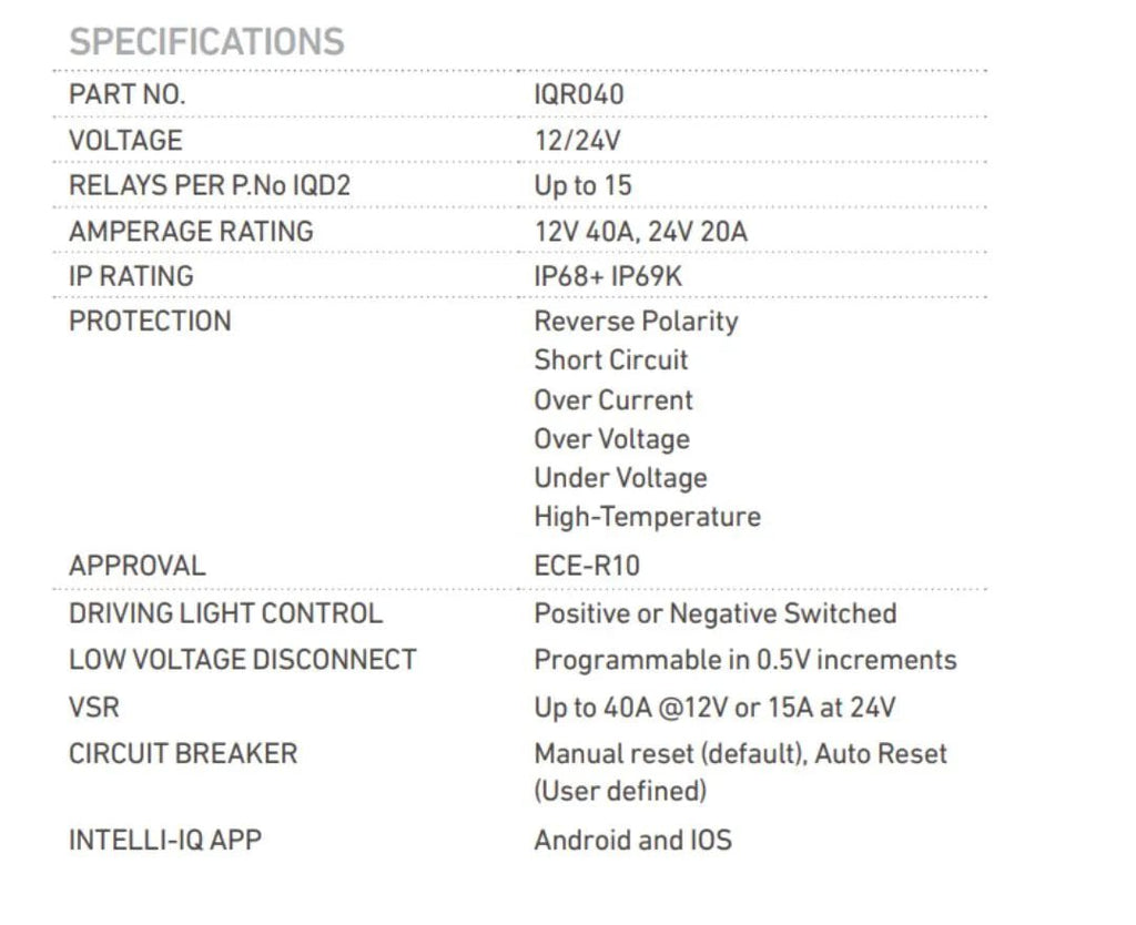 The Projecta Smart Relay – Single Channel is a fully programmable relay that transforms any connected DC device into a smart component within your electrical system. Capable of monitoring both current and voltage, it can activate at user-defined thresholds for maximum precision. Suitable for use with both starter and auxiliary batteries, it’s the perfect solution for vehicles, caravans, RVs, and marine setups. Requires Intelli-IQ 2” Smart Display (P/No. IQD2) to enable app-based control.